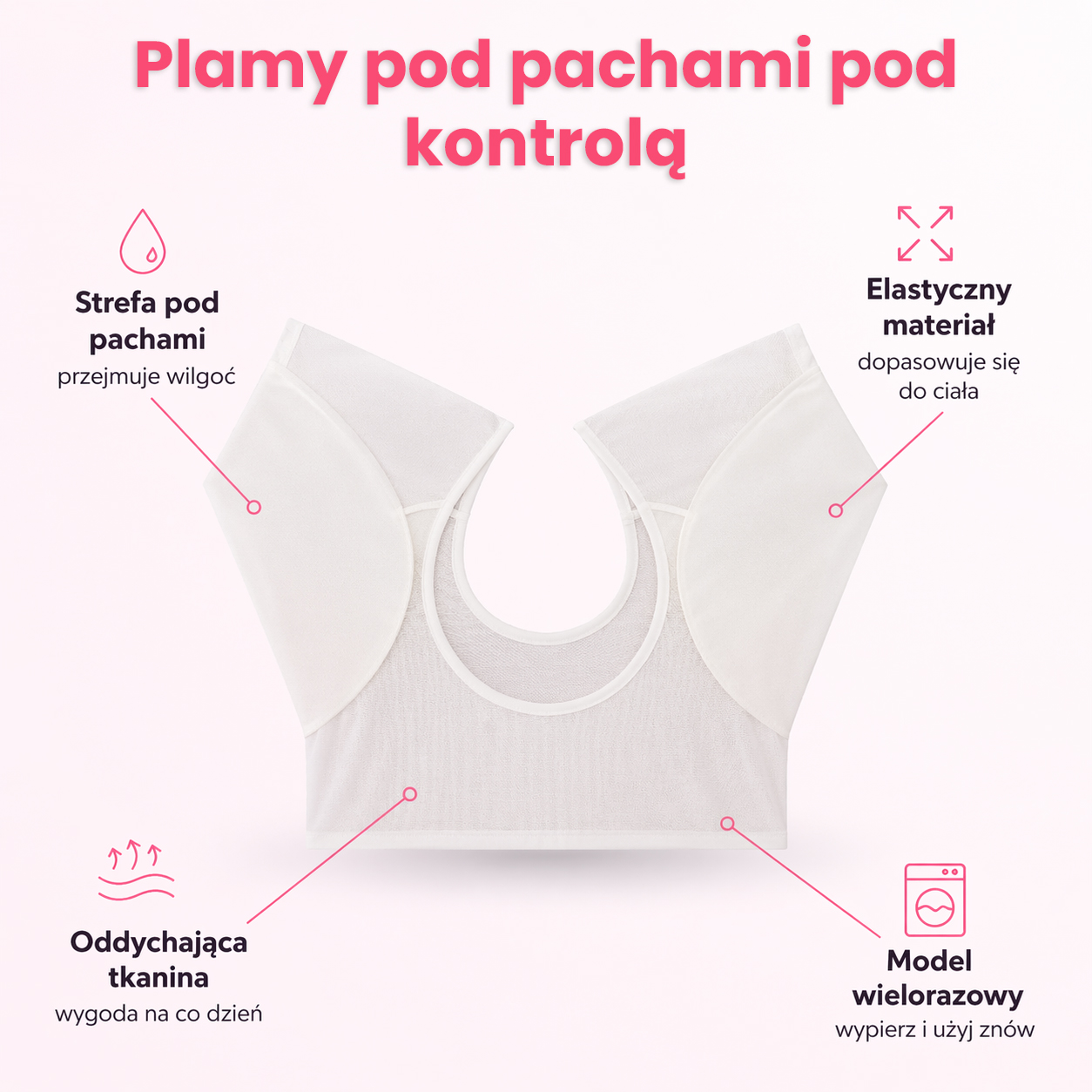Pod pachami zastosowano chłonną, szybkoschnącą warstwę, która przejmuje pot, zanim zdąży przeniknąć na bluzkę, koszulę czy sukienkę.